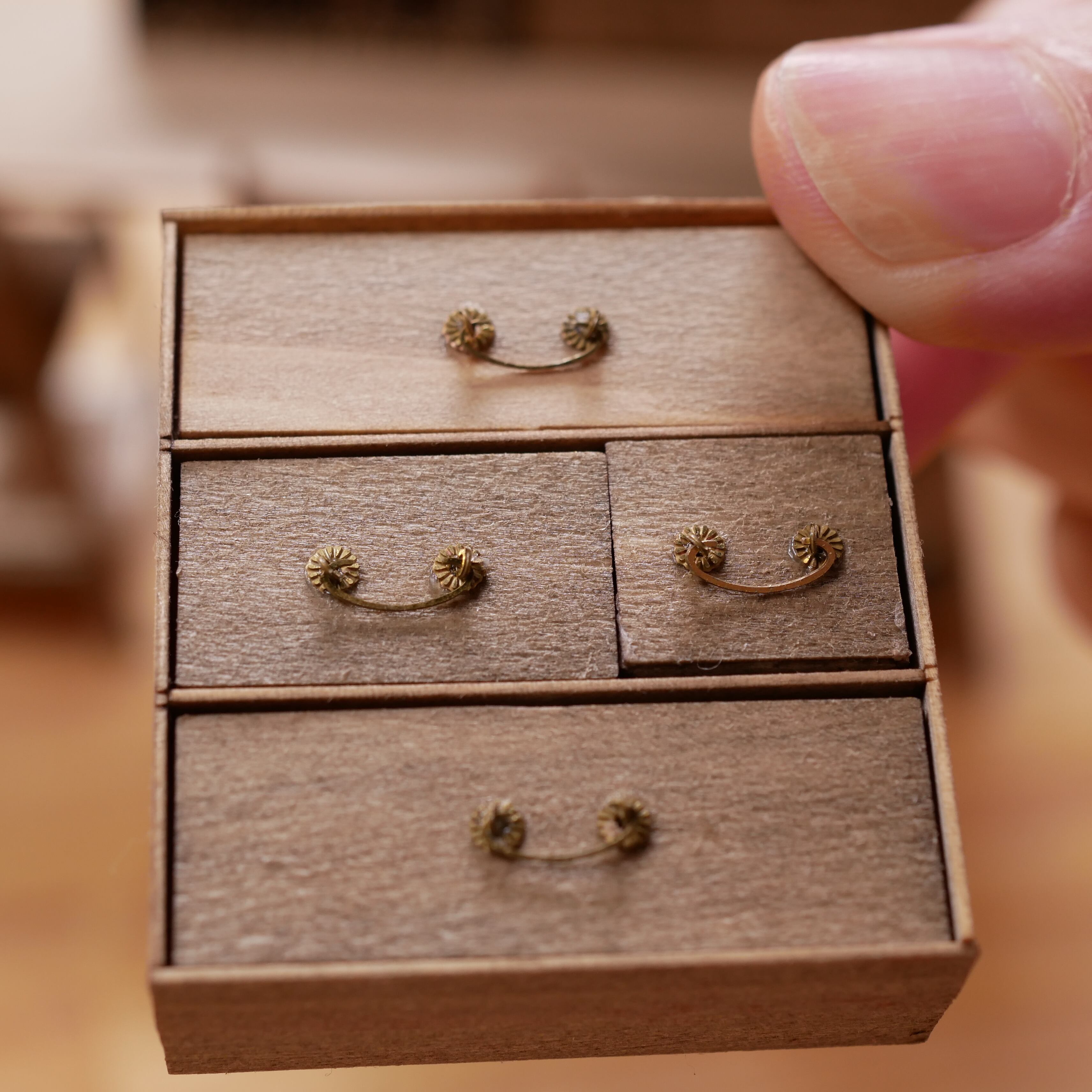 ・材料:木(薄さ約1㎜)、金属パーツ、紙部品